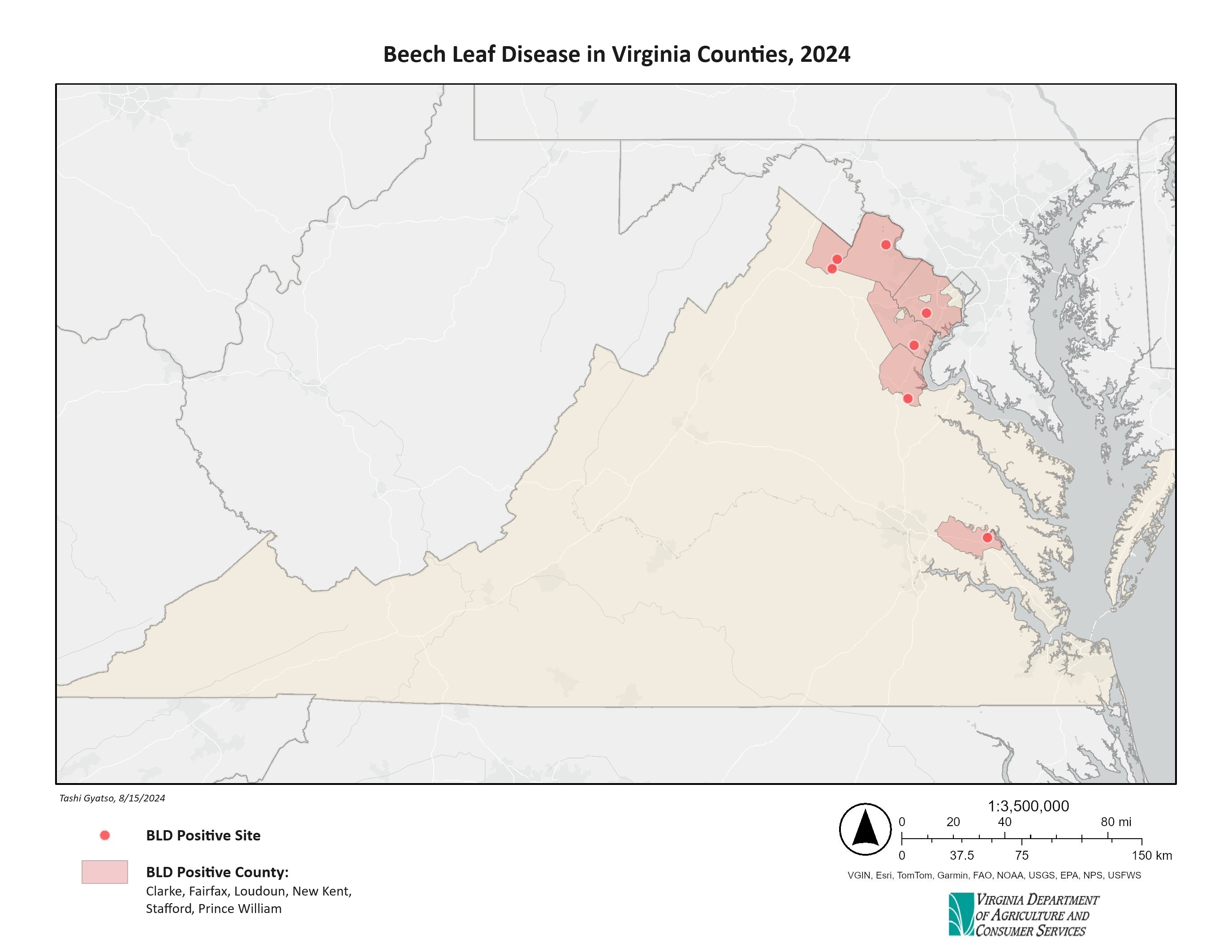 يحدث مرض أوراق الزان (BLD) بسبب الديدان الخيطية الورقية Litylenchus crenatae mccannii. تصيب هذه الديدان الخيطية براعم وأوراق أشجار الزان مسببةً تدهورها وموتها. تظهر الأوراق المصابة نطاقات بينية داكنة اللون وتصبح مشوهة وجلدية. وقد لوحظت هذه الدودة الخيطية لأول مرة في ولاية أوهايو في 2012 وانتشرت منذ ذلك الحين إلى 12 الولايات الشمالية الشرقية. كيفية انتشار الديدان الخيطية لمسافات طويلة غير معروفة حالياً. في 2021 ، تم تأكيد الإصابة بالديدان الخيطية في مقاطعة الأمير ويليام بولاية فيرجينيا، وفي 2022 تم تأكيد الإصابة بالديدان الخيطية في مقاطعتي فيرفاكس وستافورد. يواصل مركز VDACS، بالتعاون مع إدارة الغابات في فيرجينيا مسح ورصد داء البكتريا البيضاء في المشاتل وفي الغابات.