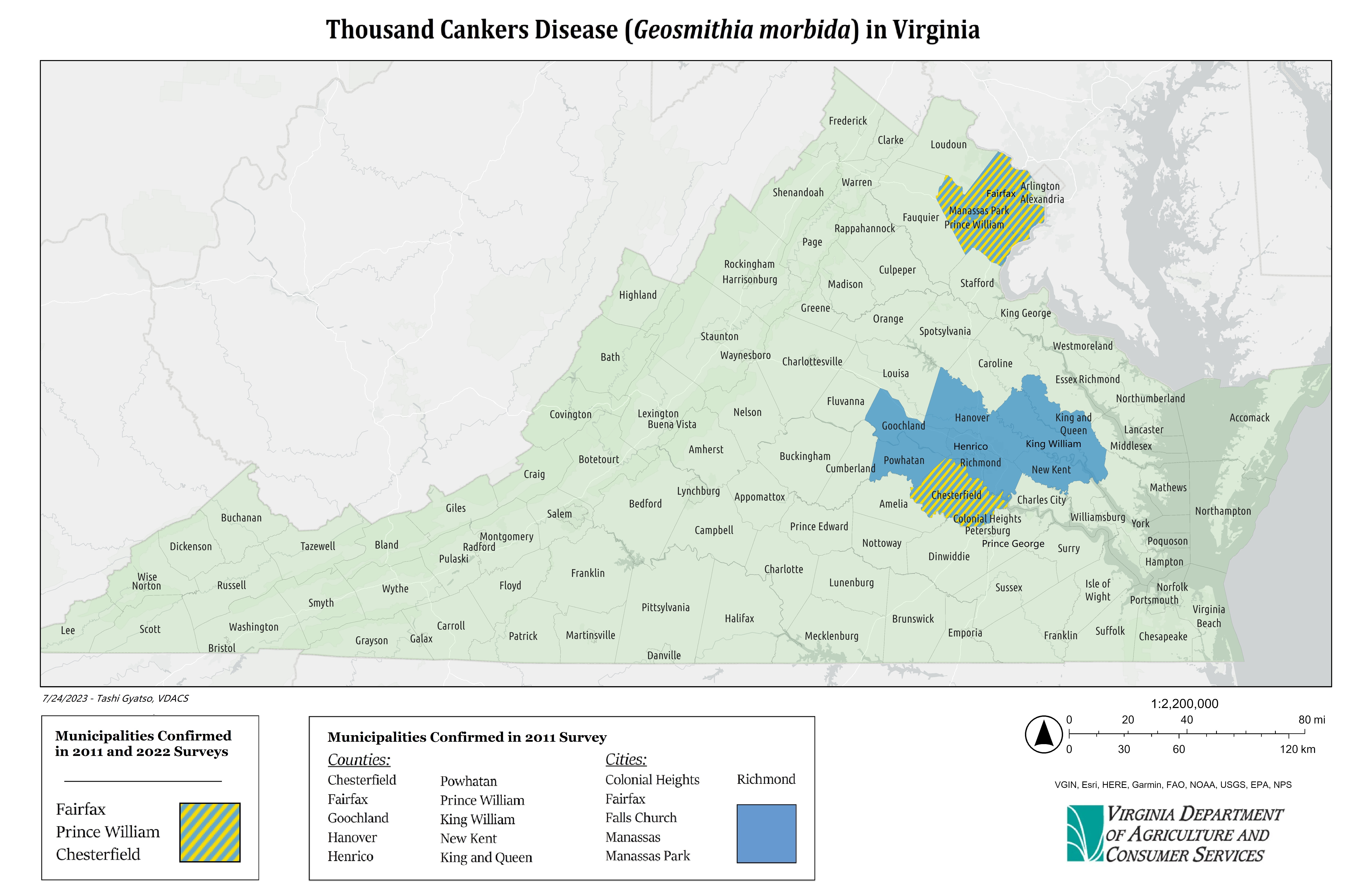 مرض ألف كانكرز (TCD) هو مرض معقد يصيب الجوز، يسببه فطر جيوسميثيا موربيدا (Geosmithia morbida) وتنقله خنفساء غصن الجوز بيتيوفثوروس جولاندس. تنقب الخنفساء في الأغصان وتدخل الفطريات التي تتسبب بعد ذلك في حدوث تقرحات صغيرة. إذا كانت أعداد الخنافس عالية بما فيه الكفاية، يزداد عدد الخنافس حتى تتجمع وتلتف حول الأغصان، مما يقيد حركة المغذيات ويقتل الشجرة في نهاية المطاف. لم يتمكن المسح من 2021 إلى 2022 من اكتشاف المرض في العديد من المواقع التي تم تأكيد إصابتها بالمرض في 2011 ، ولم يتم اكتشاف أي خنافس غصن الجوز من عمليات الصيد التي أجريت في جميع أنحاء الولاية. في أغسطس 2024 ، تم إلغاء الحجر الصحي لمرض TCD بعد أن أثبتت الدراسات الاستقصائية المكثفة أن العامل الممرض لا يشكل تهديدًا لأشجار الجوز السليمة في فرجينيا.